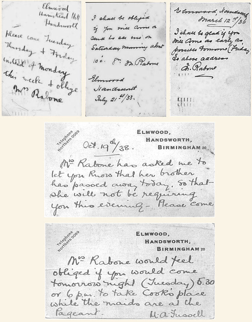 My nan Florence Pike worked for the Rabone's as domestic help from the early 1930s, I dont know when she left the Rabone's employment but I have a number of post cards that show she was still there in 1938.